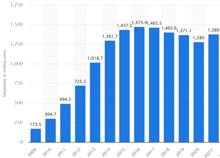 2017年以來全球手機出貨量持續下降,2021年略微回溫資料來源:Counterpoint