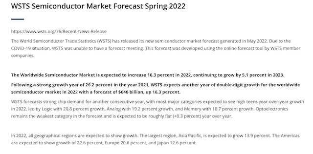 近日,半導體行業權威機構世界半導體貿易統計協會(WSTS)官網發布了關于全球半導體市場的最新預測數據。數據顯示,2022年世界半導體市場預計增長16.3%,到2023年將繼續增長5.1%。